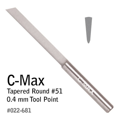 The Tapered Round has a wider top and a narrower bottom with a 0.4 mm rounded cutting edge. Use a Tapered Round for bead raising, block lettering, engraving on uneven surfaces, and line engraving. Length: 1.8″ (45.72 mm). Shank diameter: 0.125″ (3.175 mm).