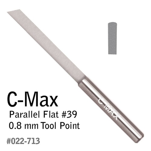 This C-Max Parallel Flat has a rounded top, parallel sides, and a flat 0.8 mm tool bottom. A Parallel Flat works well for background removal, plain or stylized borders, bright cutting, lettering script, and wriggle cuts. Length: 1.8″ (45.72 mm). Diameter: 0.125″ (3.175 mm). Use with QC Tool Holder for 1/8″ Round (#004-873).