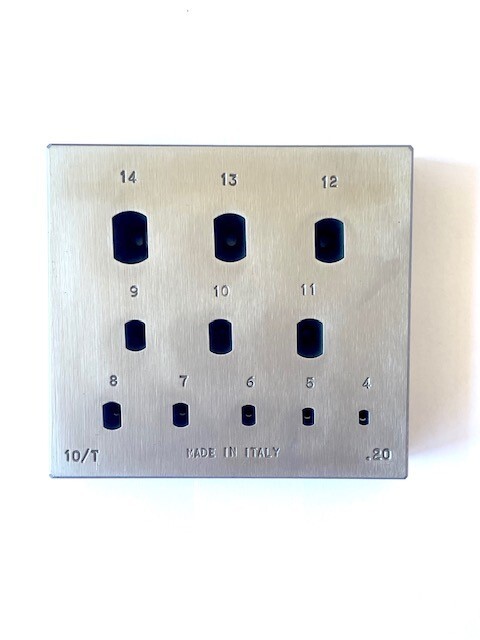 Rectangle Chamfer / Long Emerald Cut shaped punch and setting plate. Size ranges from smallest of 4.5 x 2.8mm through to largest of 14.5 x 9.8mm.